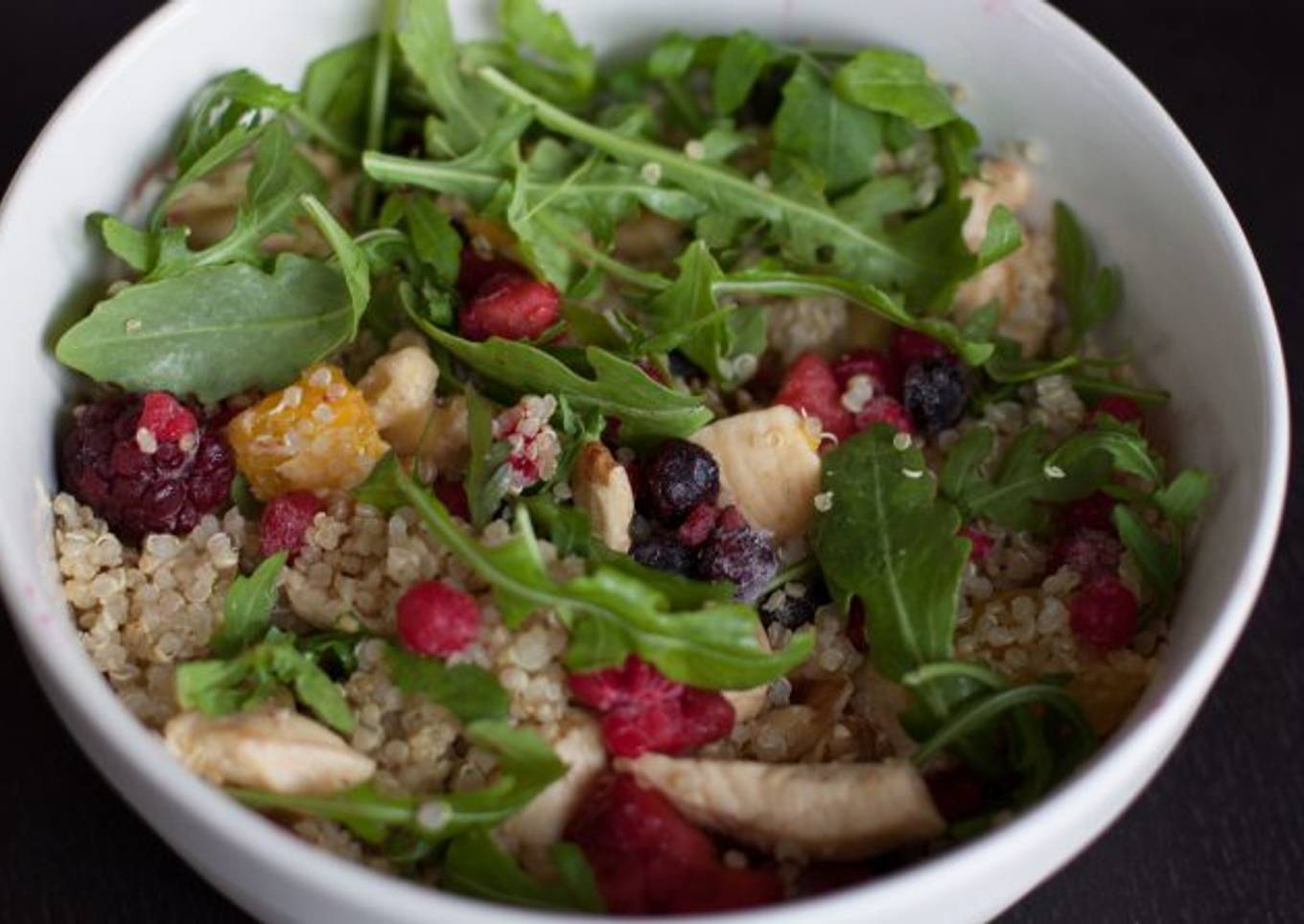 - En un bol mezclamos la quinoa ya fría, con la pechuga de pollo, la naranja, las nueces, los frutos del bosque y la rúcula.