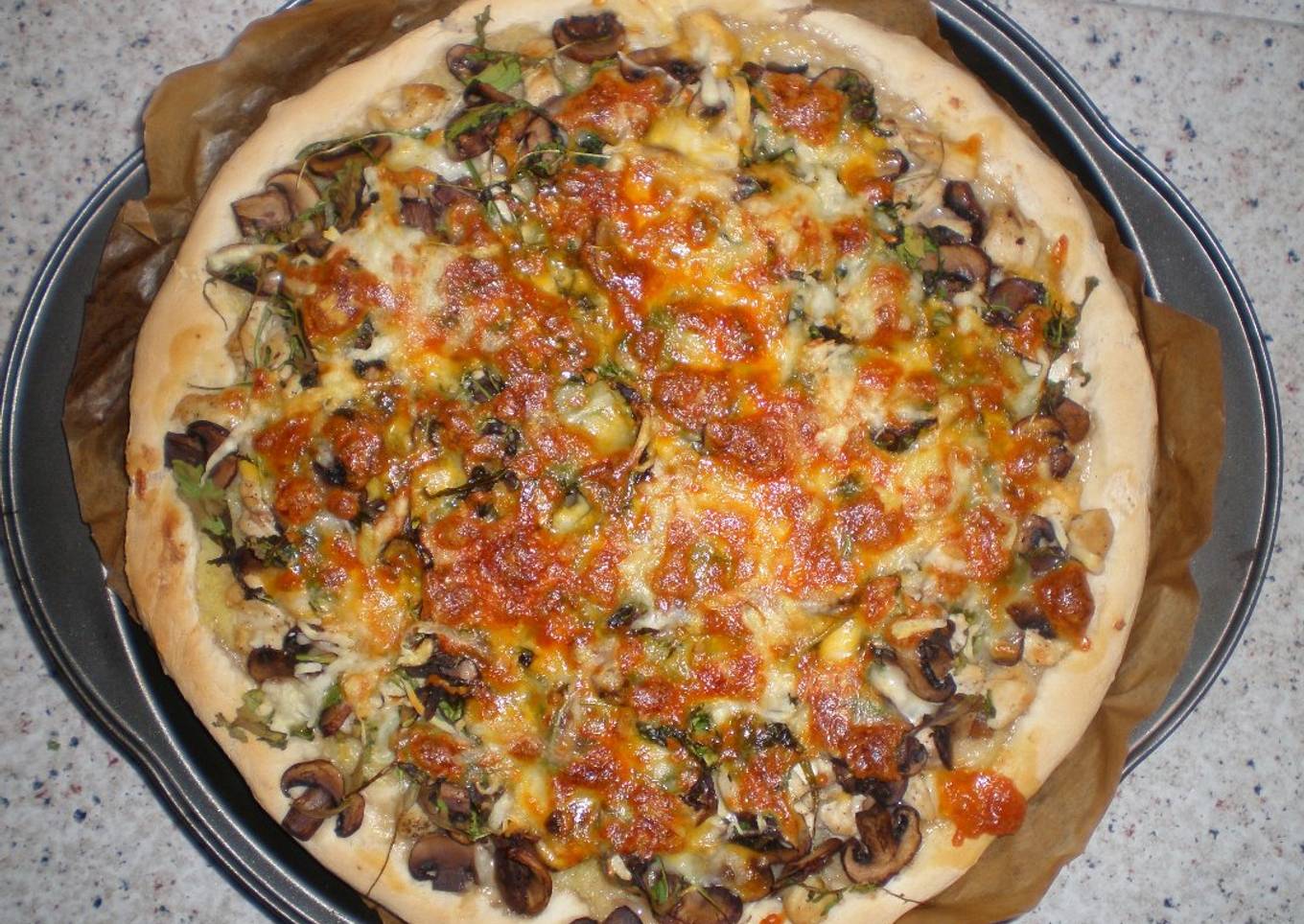 Pizza de pollo, setas y pasta de jengibre y ajo