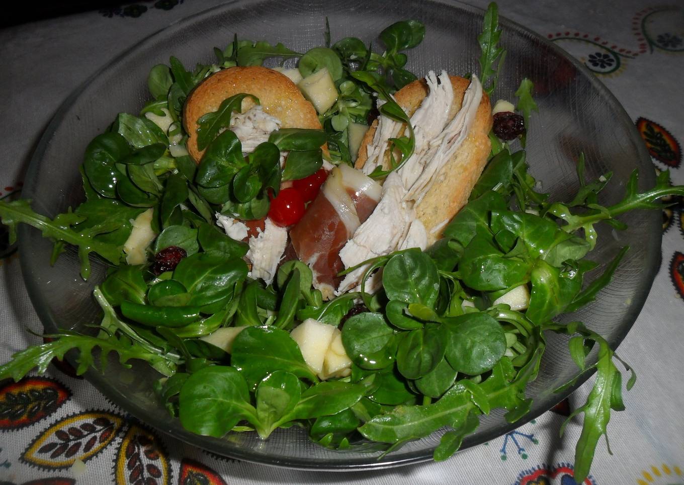 Ensalada verde con pollo, frutas y jamón