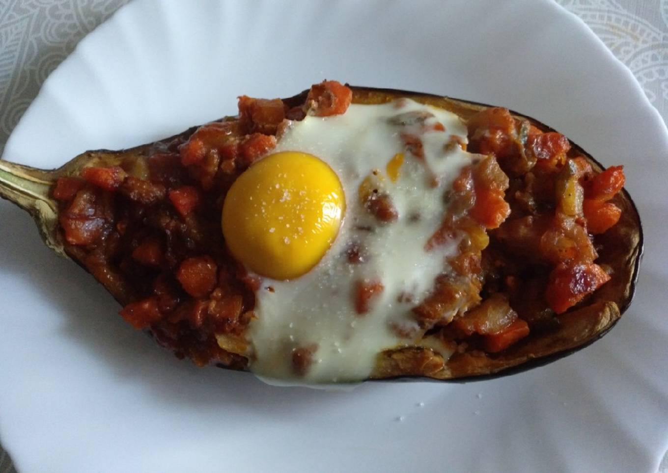 - Rellenar la berenjena con la verduras, ponerlas en la fuente del horno, se casca un huevo sobre cada una y se espolvorea con el queso (yo le he puesto solo un poco, ya al gusto).