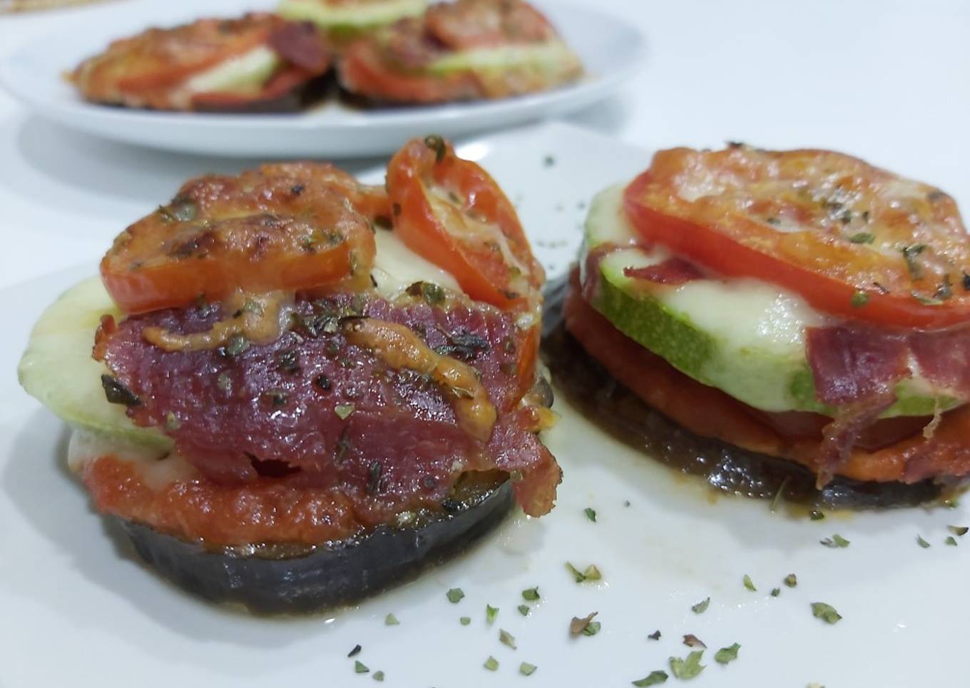 - Vamos poniendo berenjena, salsa de tomate, tomate natural, calabacín, mozzarella, jamón, tomate natural, cortamos ajito pequeño y se lo echamos arriba junto con la.mozzarella rallada y un pelín de orégano, un chorrito de aceite por arriba