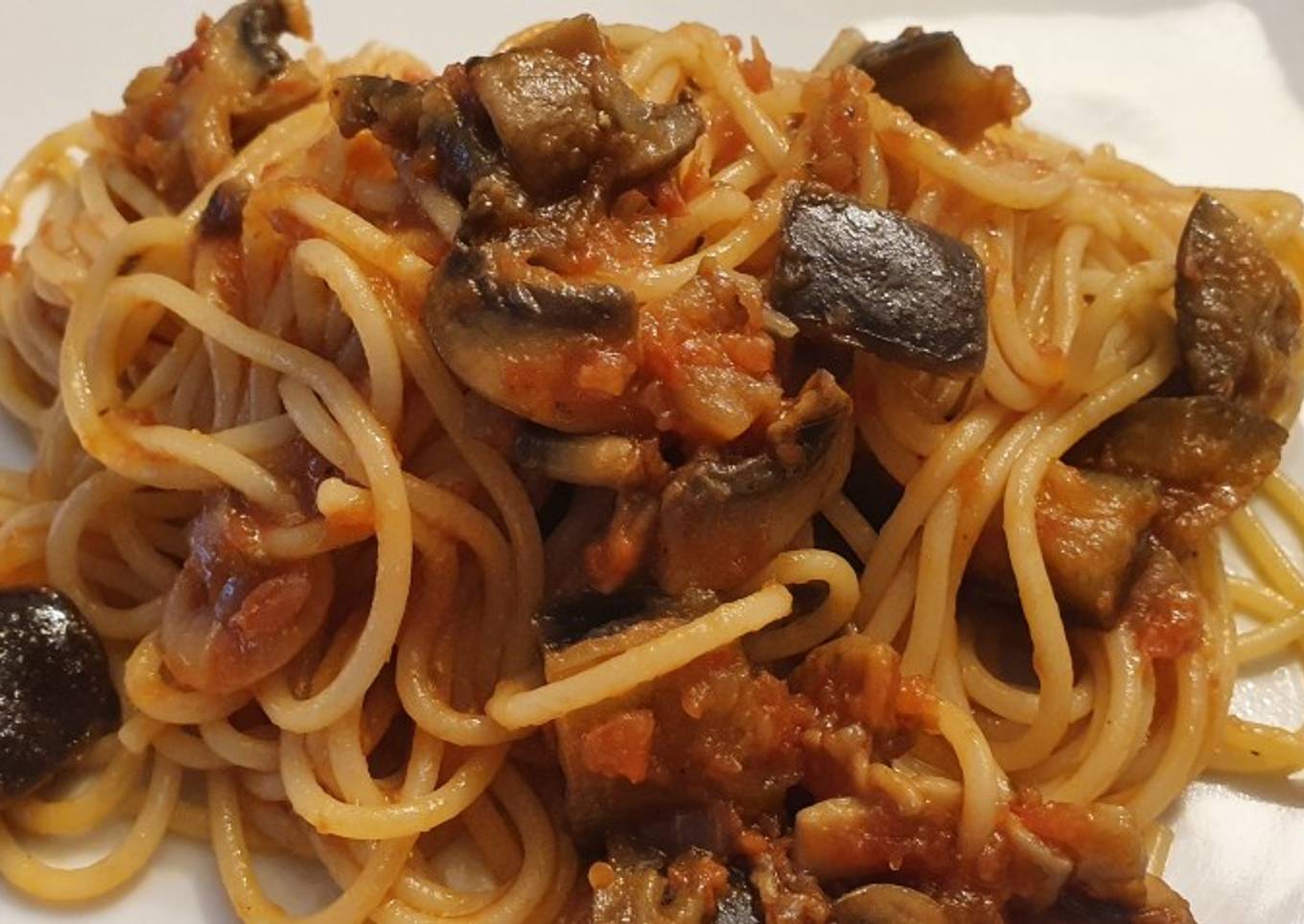 Steps to make to make Spaghetti con berenjena y champiñones Portobello