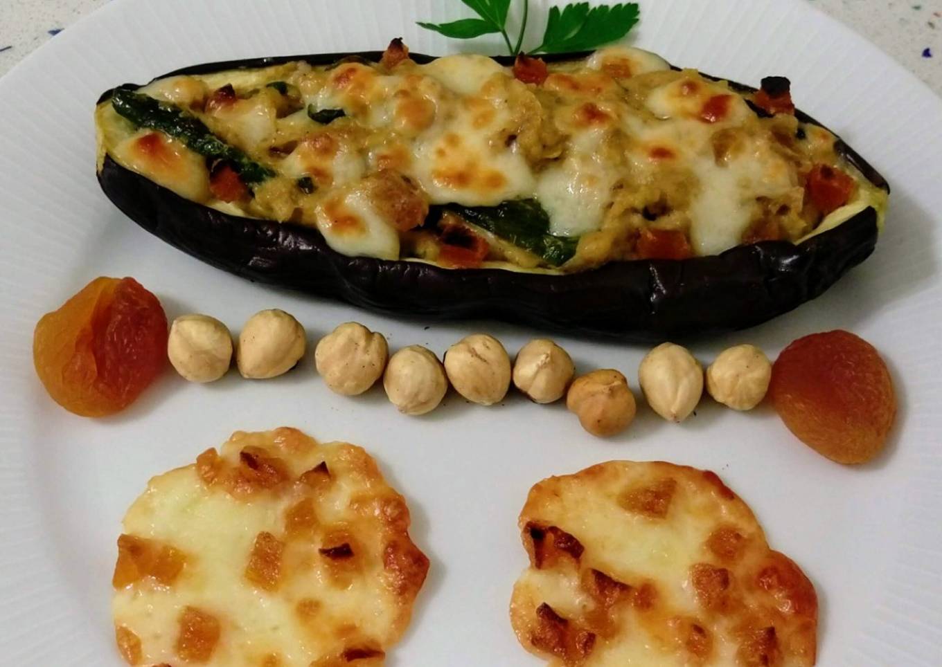Berenjena rellena de verduras con frutos secos y galletas de queso con albaricoques