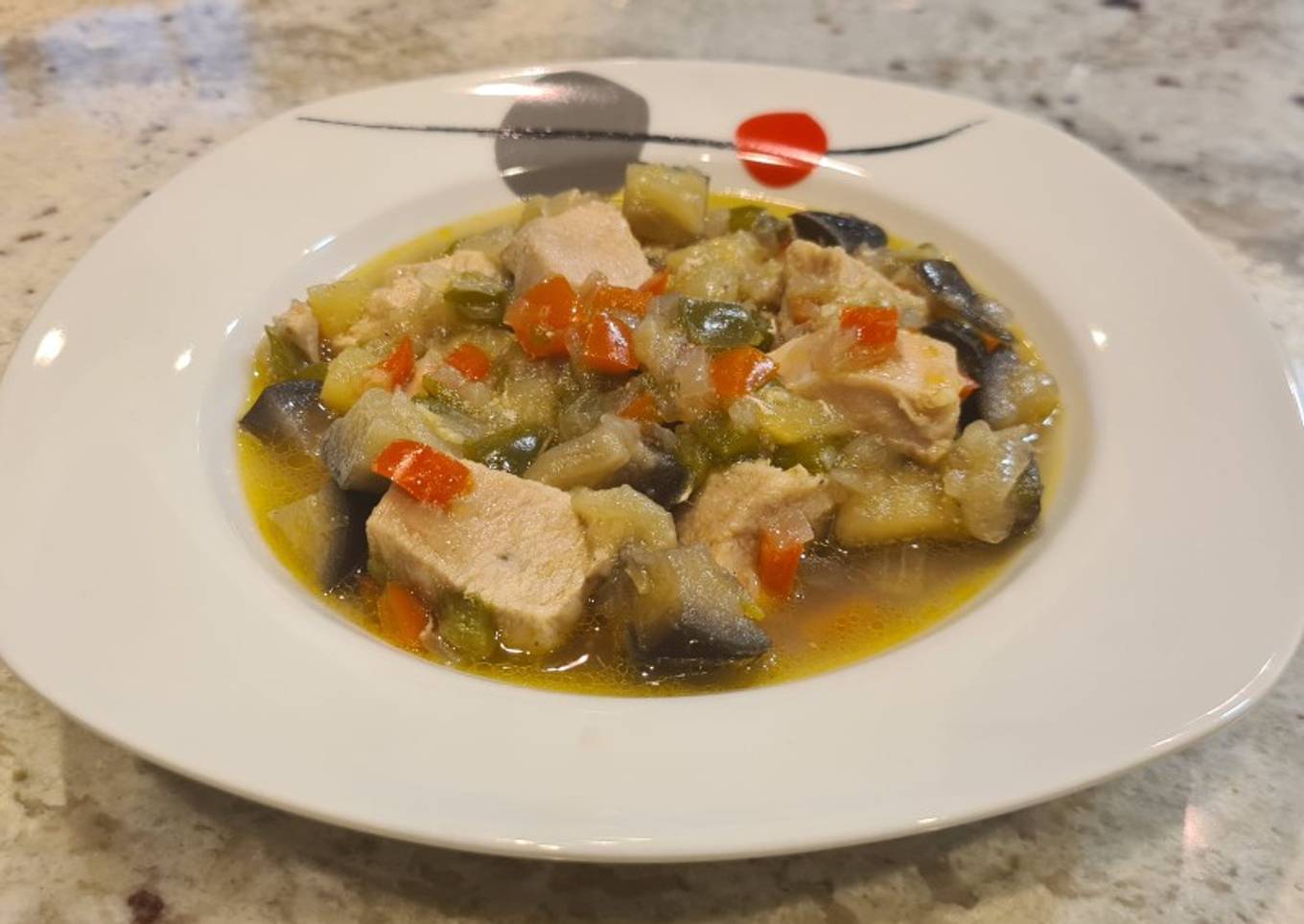 Guiso de pollo con berenjena, calabacín y pimientos