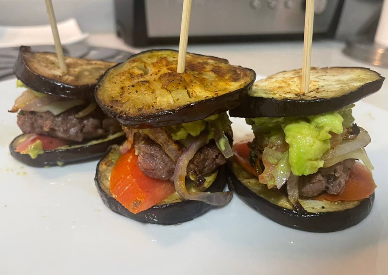 - Empezamos a montar las hamburguesas!! Ponemos una base de berenjena, añadimos la mini hamburguesa y por encima colocamos un trozo pequeño de queso, la cebolla cocinada y un poco de guacamole.