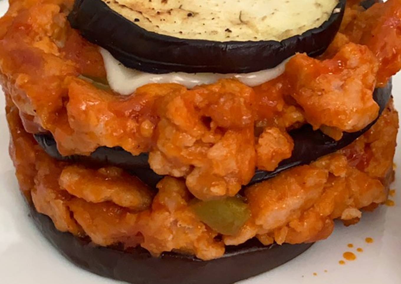 - Cuando tenemos todo listo empezamos a montar. Primero una base de berenjena, luego otra de carne y encima un trozo de queso en lonchas. Y asรญ sucesivamente hasta llegar hasta arriba del recipiente.